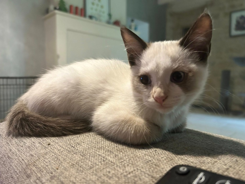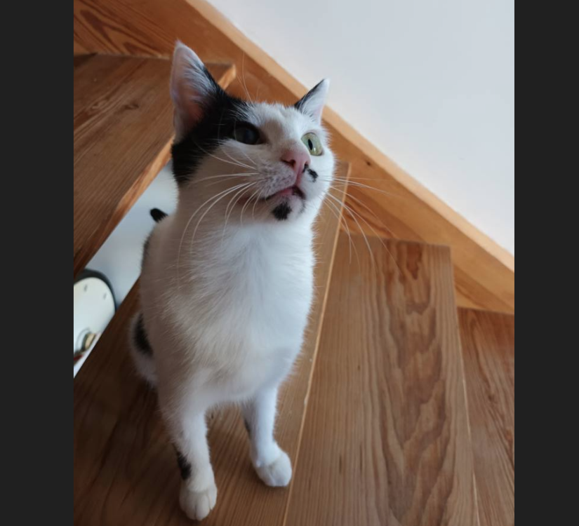 Maintenant, elle aspire à trouver le bonheur dans un foyer aimant et calme. Elle est timide et craintive mais se dévoile petit à petit avec de la patience. Elle est très câline et vient chercher les caresses mais n'aime pas être portée ou venir sur les genoux pour l'instant. Vu qu'elle est très gourmande, cela peut aider à l'amadouer et créer un lien de confiance.