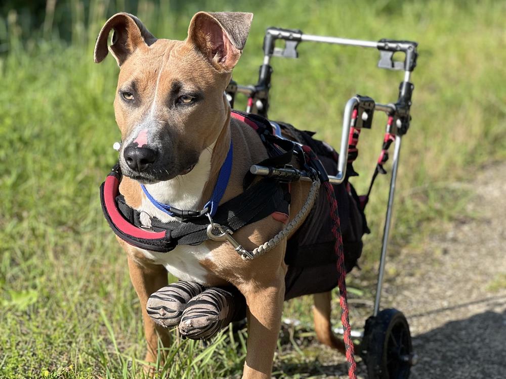 Elle souffre d'une paralysie du train arrière, mais qu'à cela ne tienne : madame se débrouille comme une cheffe ! Elle a simplement besoin d’un chariot pour se mouvoir lors de ses sorties. En revanche, sa paraplégie la rend incontinente, donc il peut y avoir des accidents à la maison...