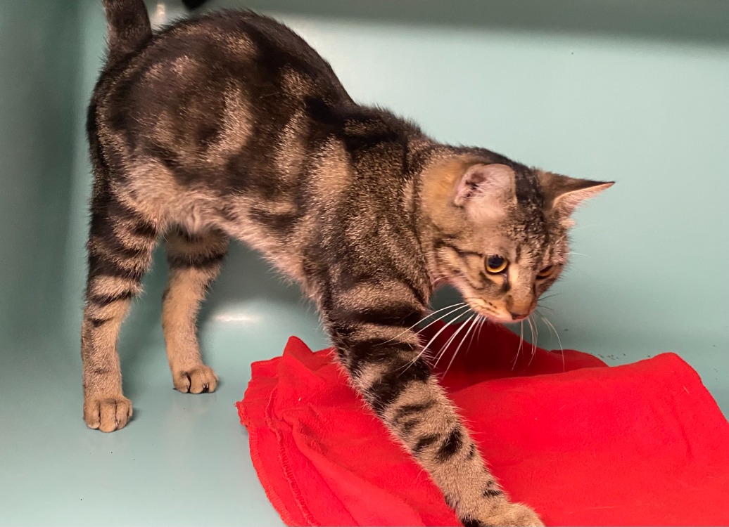 Elle vivait dans la rue et nous a été amenée car des personnes se sont inquiétées pour elle au vu de son âge. Mais Peach est sociable, elle peut vivre au plus proche des humains. On a du la raser car elle était en trop mauvais état. Depuis, elle porte son body avec bonheur.
