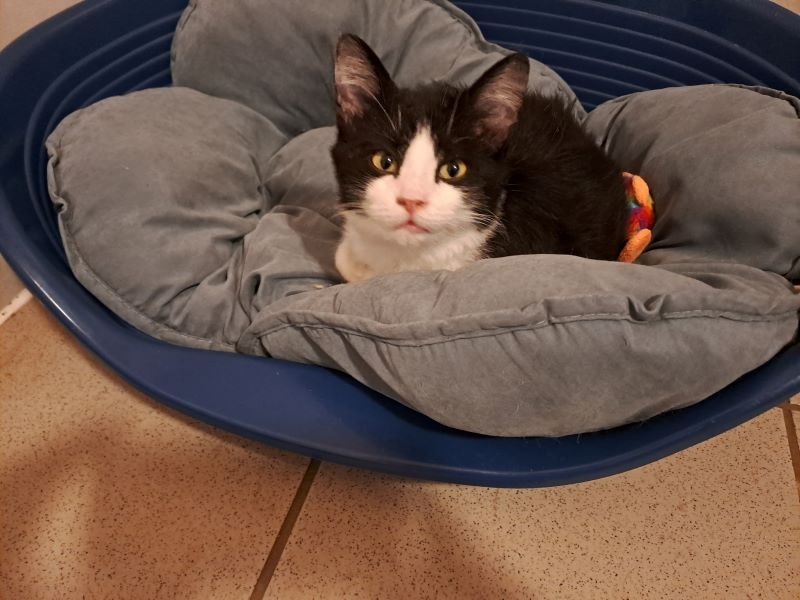 Mango est arrivé de fourrière. Il est plutôt craintif et il tolère le contact mais il n'est pas rassuré. Il lui faudra de la douceur, de la patience et de la tendresse pour évoluer. Idéalement, il aura besoin d'un petit espace au départ pour mieux être apprivoisé.